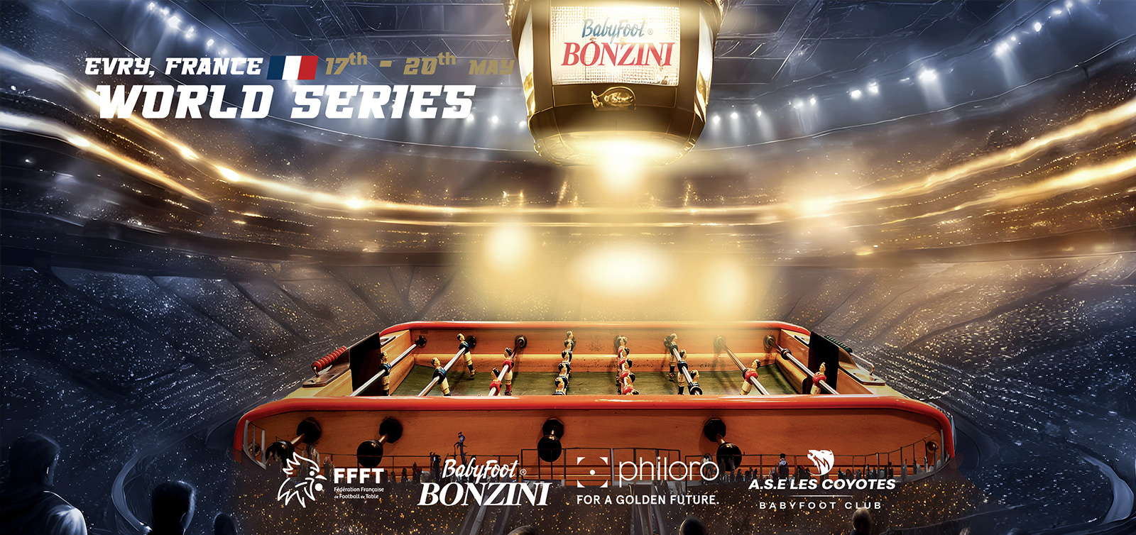 La compétition commence ! Rendez-vous du 17 au 20 mai 2024 à Évry dans l’Essone, en Ile-de-France, pour l’étape BONZINI des Championnats du Monde de Babyfoot !