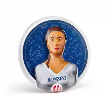 Impreso en cuatricromía sobre metal, este pin presenta el retrato de una de nuestras jugadoras emblemáticas de la colección « Mesdames Messieurs»