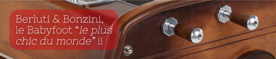 Le baby-foot Bonzini by Berluti est fabriqué à la main en France ; le meuble et les poignées sont entièrement gainés de cuir Venezia ; les joueurs sont en aluminium brossé et chromé, les cages en aluminium poli et le tapis de jeu est noir marbré de blanc.